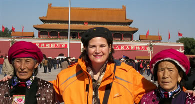 Nancy Snow makes new friends while visiting various sites, including Tiananmen Square.